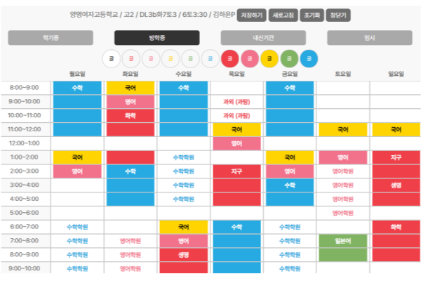 1교시 | 주중 | 5:20-6:00 | 6:10-6:50 | 7:30-8:10 | 90분 | Daily TEST + 1:1첨삭지도 |